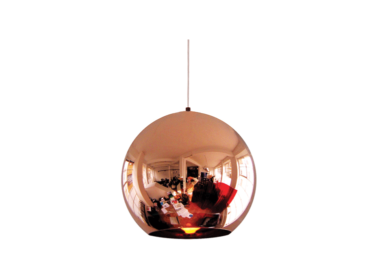 A pendant light made using copper, a material more commonly associated with solar cells and microwave radiation. The Copper Shade is created by exploding a thin layer of pure metal onto the internal surface of a polycarbonate globe. The result is a highly reflective surface with a warm metallic glow.