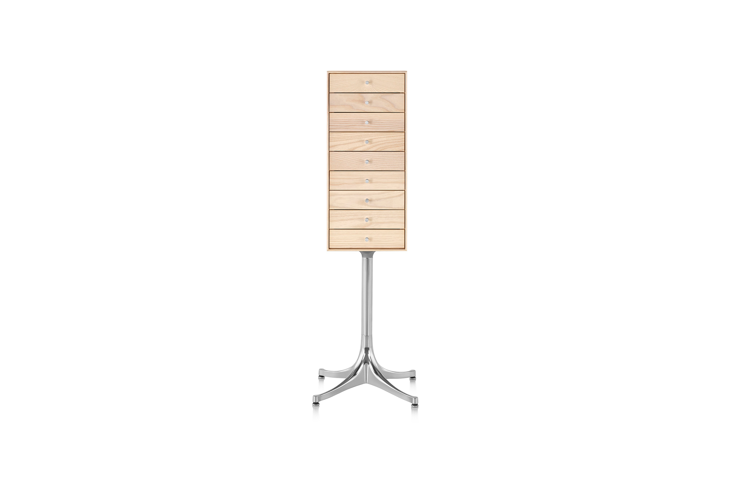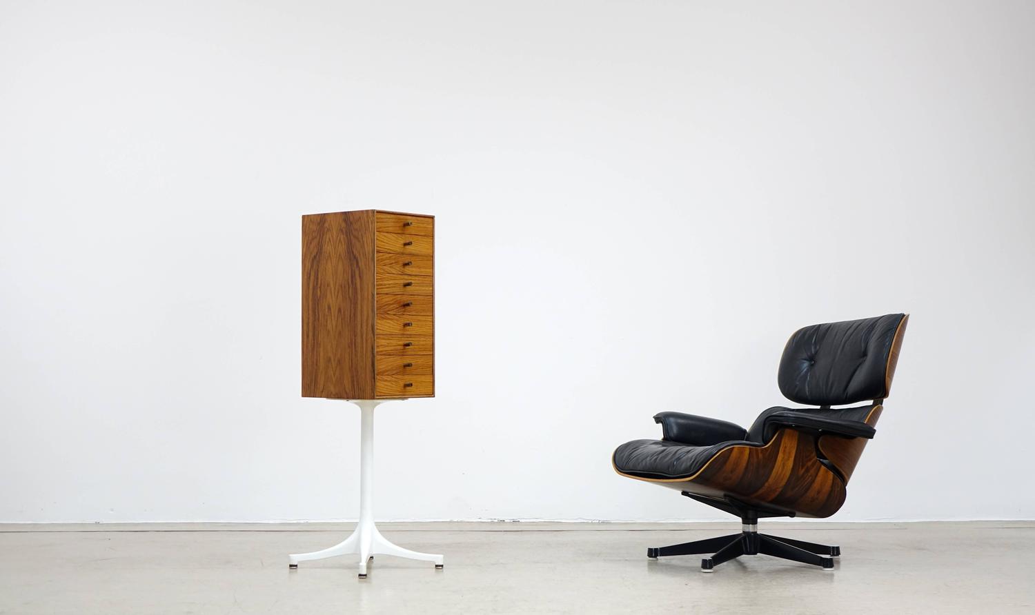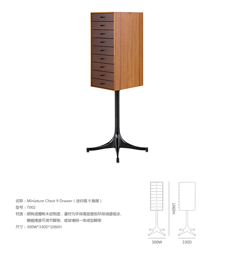 乔治·尼尔森(George Nelson)是美国极具影响力的建筑师、家具设计师和产品设计师,日本对George Nelson有着深远的影响。在他于1951年第一次到东京旅行,以及之后在那里的十几年,George Nelson迷上了日本的所有东西。这种影响最明显的的他于1952年设计的迷你箱。迷你箱的神奇处是可用来存放各种物品,是一个很多小抽屉小储物柜,方便您分类摆放各种生活物品。尼尔森设计的迷你箱最让人惊奇的是它几乎可以摆放在任何房间,无论是卧室,办公室,客厅等等任何您需要的地方,美观且不失和谐。每个抽屉都是木工们细心的安装设计,以保证高品质。抽屉采用胡桃或樱桃木皮贴面,基材为环保高密度板环保油漆喷涂、铸铝烤漆可调节脚架(4星级铝底座)、或玻璃钢一体成型脚架,抽屉贴心的配置有金属旋钮,方便打开与关上。