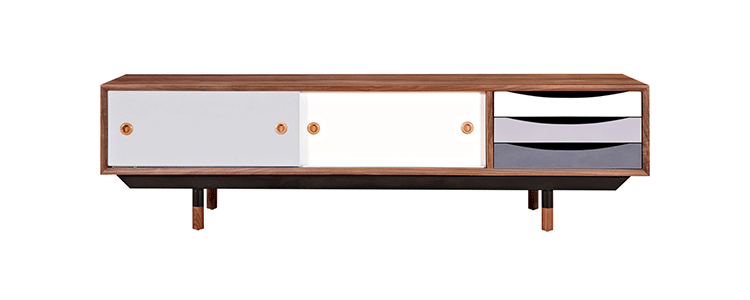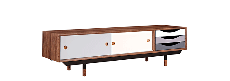 color theory media cabinet(色彩原理电视柜)是Kardiel公司制作的经典实木家具,具有世纪中期的现代风格,设计于1955年。配有三个梯度的滑动抽屉和两个隐蔽的推拉门的小隔间,存储容量非常大。在现代主义的存储家具上, Finn Juhl和 Arne Vodder 最先尝试胶木和天然木的组合运用。这是大胆的创新,他们结合传统的新鲜的新兴技术与现代主义的概念。制作采用精选MDF板基材胡桃木或水曲柳木皮贴面、胡桃实木或水曲柳实木脚架、环保油漆喷涂、做工精湛,是您理想的选择。