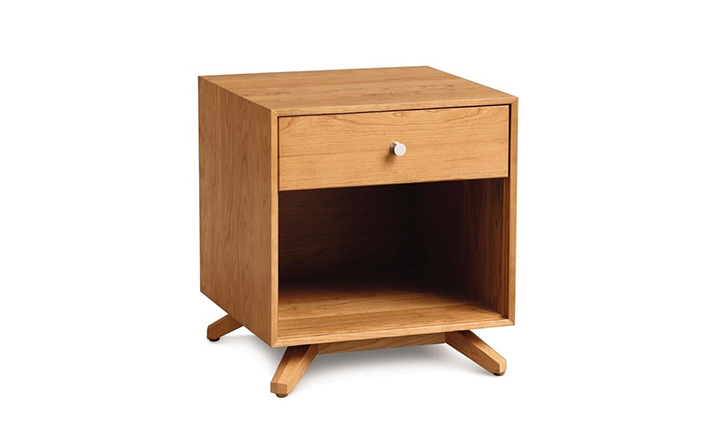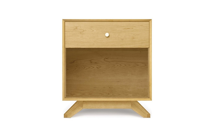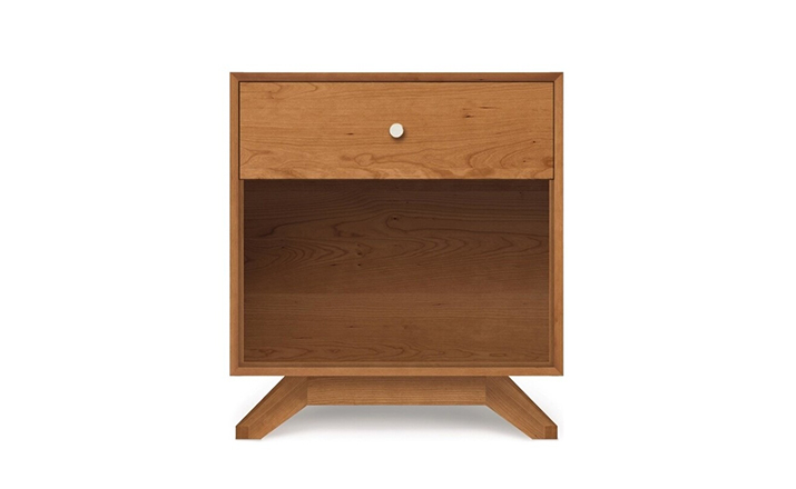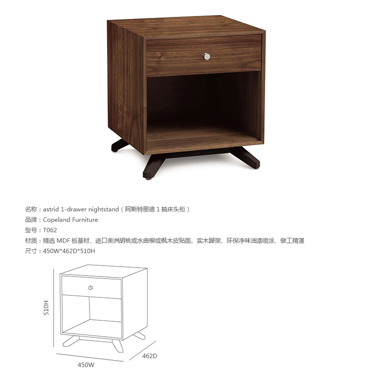 astrid 1-drawer nightstand(阿斯特丽德1抽床头柜)宽大的八字形脚架非常吸引人注目,制作阿斯特丽德1抽床头柜并非易事,它其实是一个大工程,同时能引发无限期望和激情,安放在阿斯特丽德床旁边看起来非常美妙,制作采用精选MDF板基材、进口美洲胡桃或水曲柳或枫木皮贴面、实木脚架、环保净味油漆喷涂、做工精湛,完全对味。