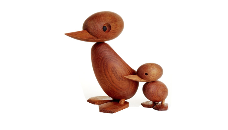 Wooden Duck And Duckling(木鸭与小鸭子)的制作灵感来源于真实的故事,故事回到了1959年丹麦哥本哈根的春天场景。正当人们与自然万物自由的伸展苏醒时,某天,在Frederiksberg街头出现了春天出游的鸭妈妈正带领着一群呱呱叫的可爱小鸭过马路的画面,随后,出现了一位警察为牠们指挥交通并顺利的过了马路,隔天报纸就刊登出这幅景像并引起广大的回响。这看似不可思议的美好事件却反应出丹麦人珍惜呵护自然的天性,在与之共处的过程中总是细微观察并不断的上演着触动人心的情景。在那重视手工艺的黄金50年代,全球正掀起了一股「斯堪地那维亚现代主义设计」风潮,丹麦设计大师Hans Bølling为推手之一,他因为鸭子事件的报导而深受感动,因此设计了手工木鸭,作品中不但展现出简洁有机的线条并揉合了精湛的手工艺技法,且将主题延伸至人文社会环境的关怀,以独特的事件观点触动人心,而这正是「斯堪地那维亚现代主义设计」所要反应出的设计观点。这款1959年份出品的手工木鸭,虽经历了半个世纪之久后再度问市,却依然深得人心。当二十一世纪的人们开始了解到美好的生活似乎越来越像个神话,而地球上的物种灭绝的速度比科技发明来得快且无解时,出现了回归自然与环保的声浪,人们因此更懂得珍惜自然以及传统手工艺的经典设计,一种无法被工业化所取代的价值感与慰藉。
