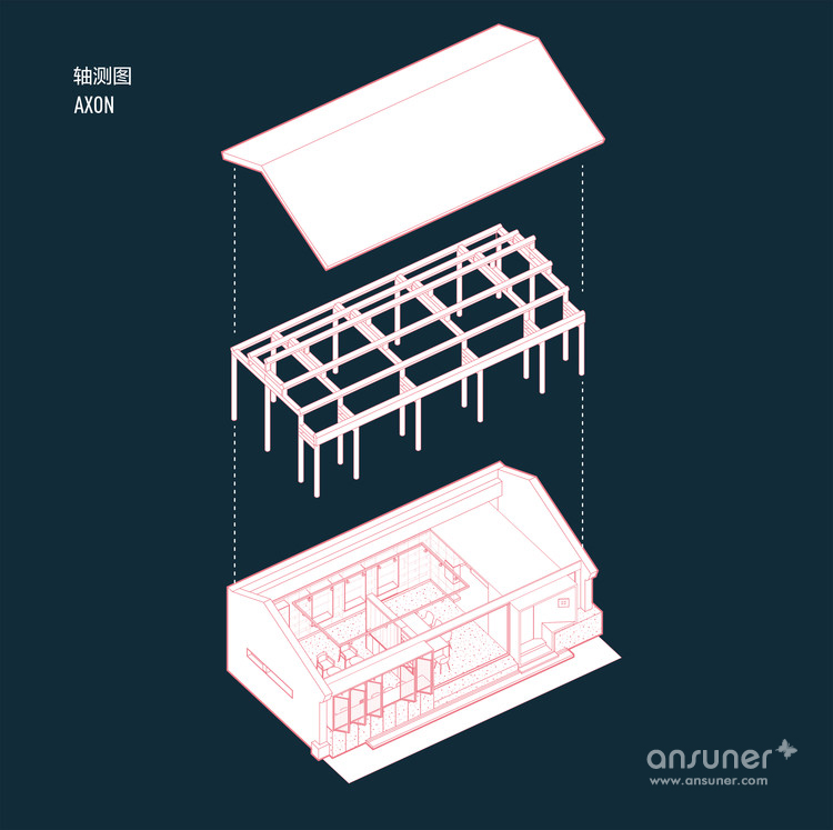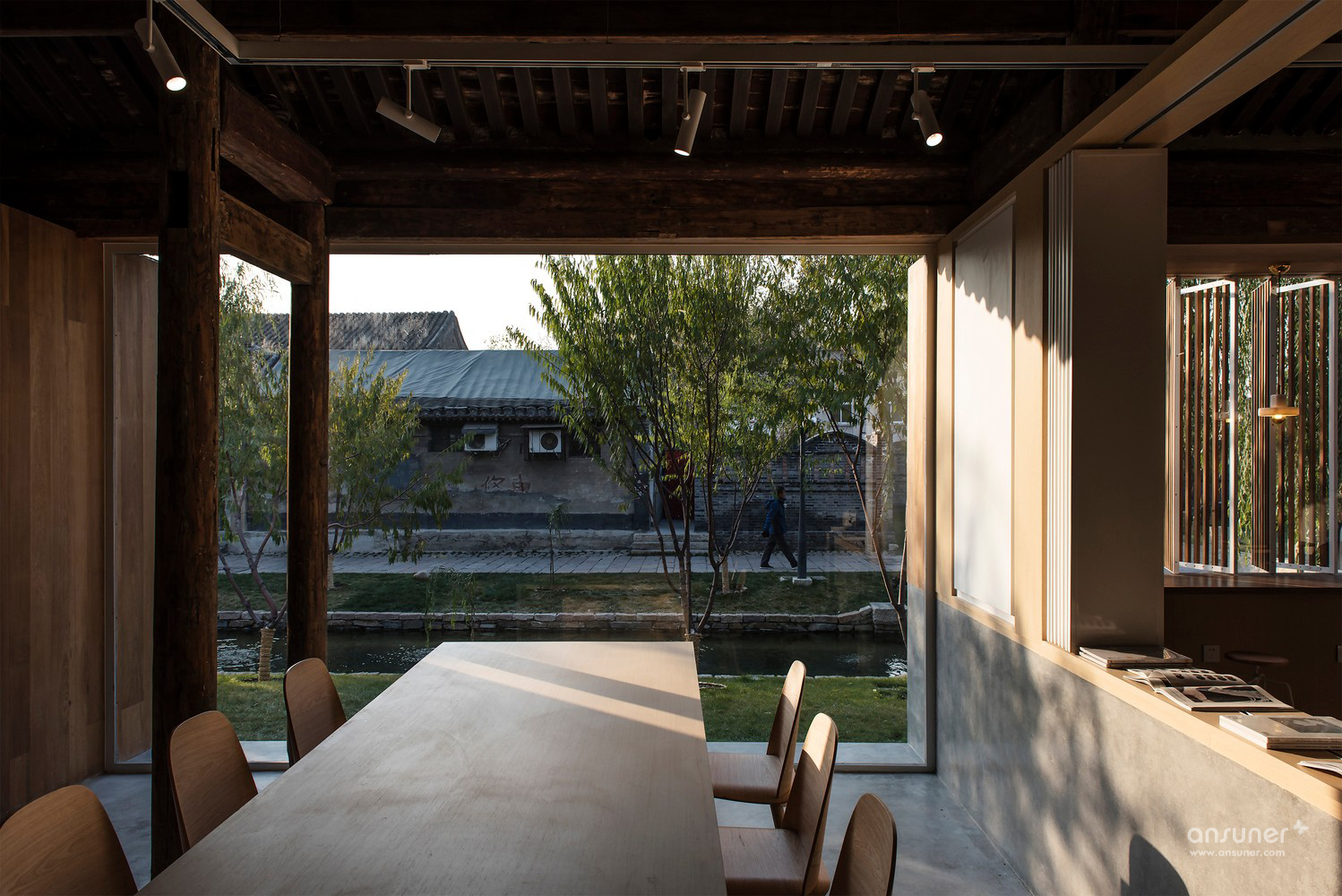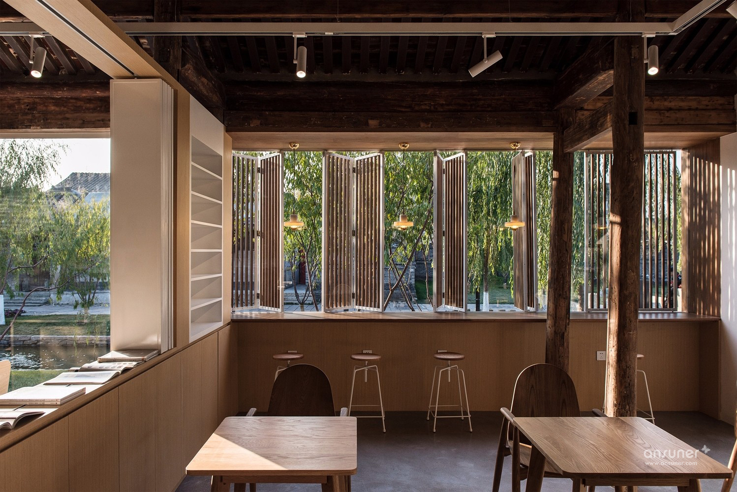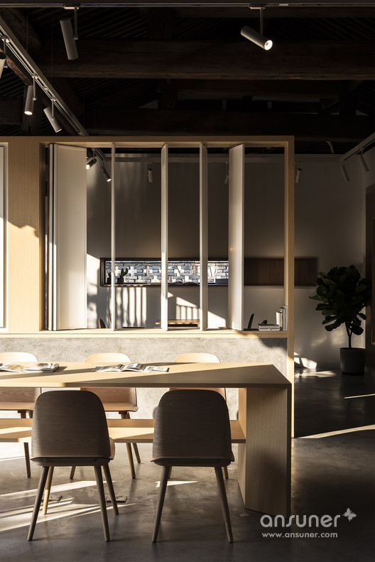 在灰色水磨石的连接下,沿河的立面用节奏较为舒缓的矩形体块排布开来。其中主入口连接了室内吧台区域,将它们组合在一个盒子当中嵌入房间,形成了简洁明确的功能划分。为书籍展示和阅读讨论设计的大工作桌放置于敞亮的玻璃窗旁,停留在此能感受饱满和谐的阳光和窗外恰到好处的小河垂柳。西侧格栅折叠窗设计巧妙地在回应传统装饰语言的同时也可用于夏日遮阳。