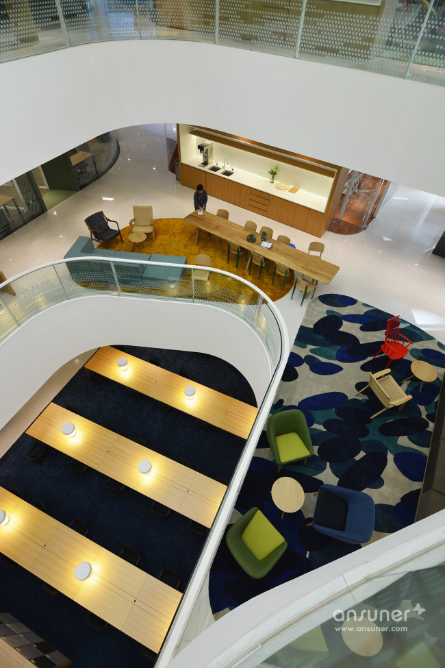 设计师决定善用购物中心的空间, 将商场过道巧妙的布局为work station lab,把原有的商铺空间改建为让租客悠闲relax的café和开放式茶水间,舒缓紧张的工作节奏。此外,如何改装两个宏大明亮的中庭,让它们作为整个3Q的核心焦点,无限发挥3Q鼓励networking的凝聚力?