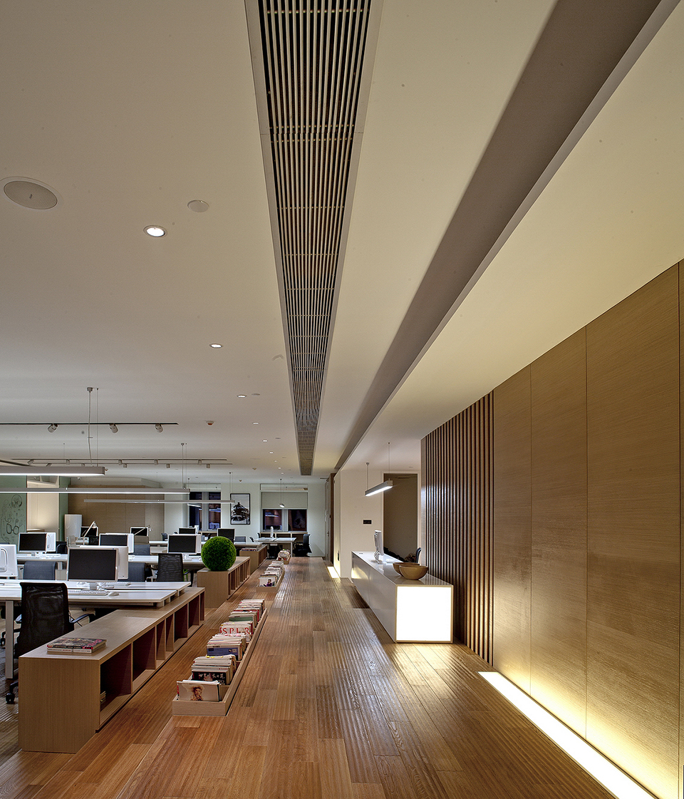无论是下沉式设计部,开放式茶水间或者储书方式,灯光,家具,都是在构建聚落式场景,减少对着电脑呆滞的时间,能更随性的阅读书籍,调试衣物板式,选择物料,同时交流,分享设计。良性的工作环境,良性的竞赛及分享意识。