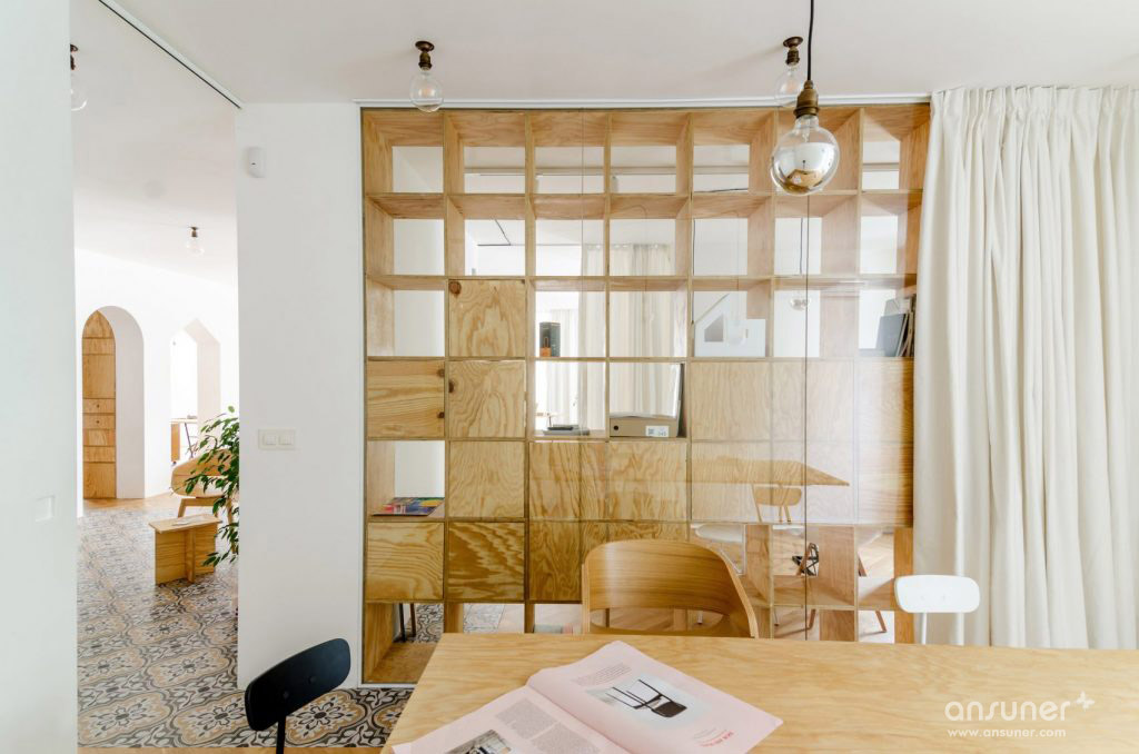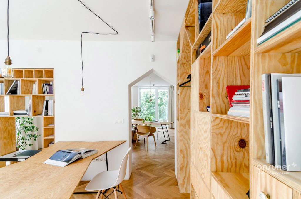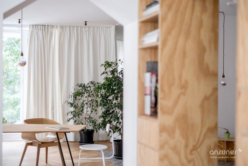 为了实现这一点,他们拆除了前公寓的所有承重墙,将其改造成一个开放式的工作室。然后他们使用胶合板建造新的隔板,整合了货架,立方木,抽屉和橱柜。由于这些特征开口,它们确保不同的区域在视觉上相连。建筑师还添加了半透明的白色棉花窗帘,以便在必要时可以进一步分隔空间。