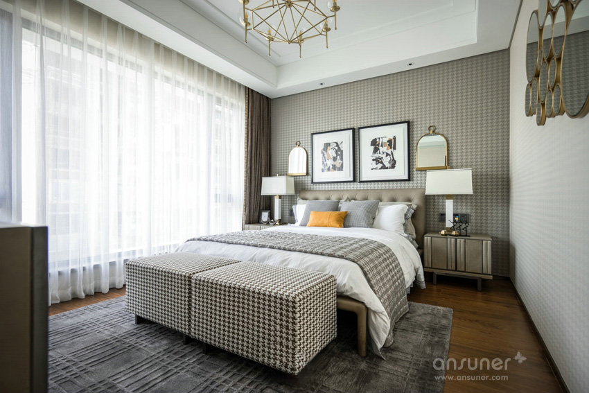 设计师利用对色彩的敏锐视角,以做旧的古罗马灰为主色调表达了主卧空间的优雅和感性,独具风情的格纹地毯,工艺精细的斗柜,艺术装饰画和精心布置的装饰品,让空间有着不同韵律的过渡。