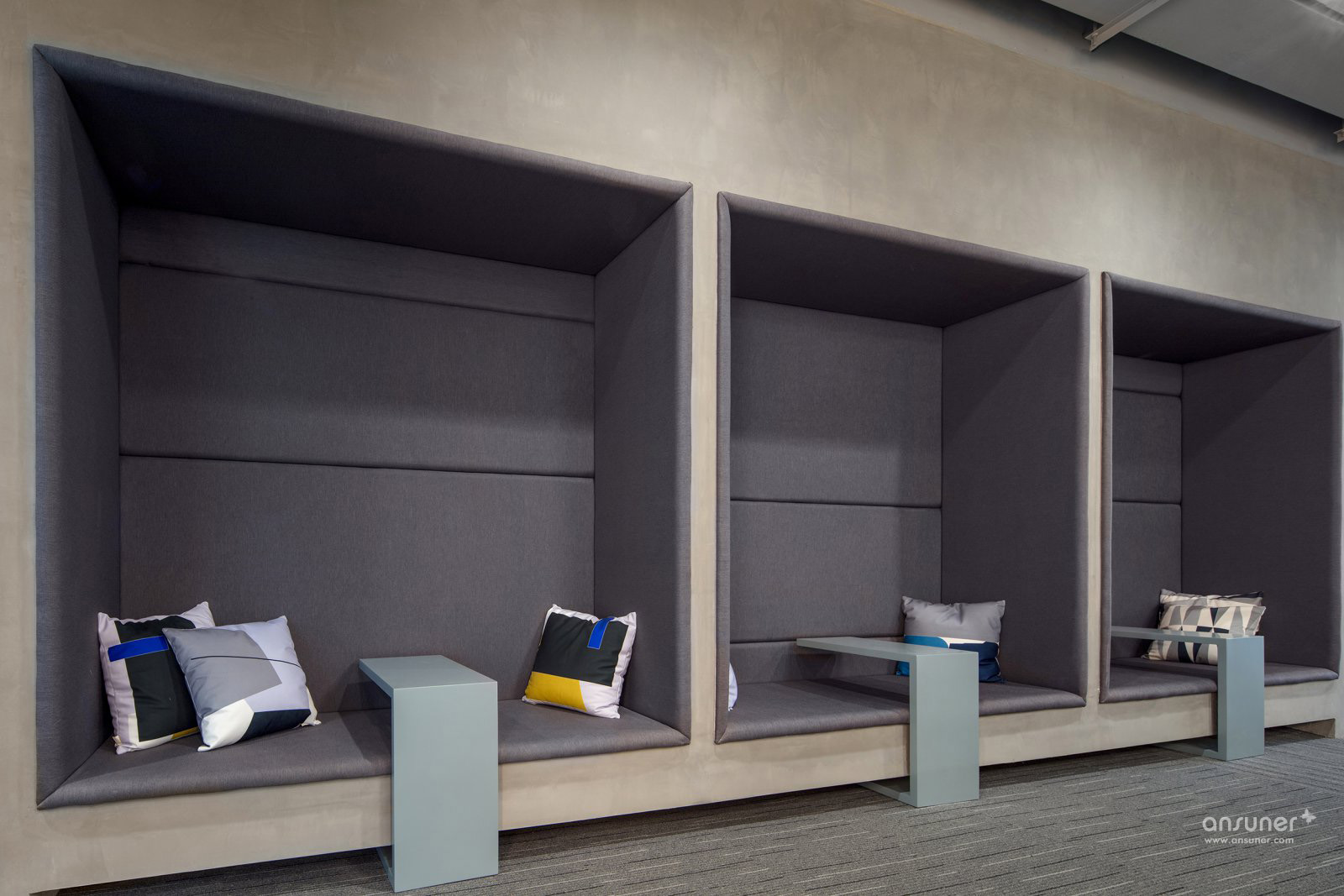 在软装材料的选择上,以具有高级质感的棉麻、PU、绒等面料,配以家具的浅木饰面,结合大理石、陶瓷、水晶以及金属配件营造一种精致大气的商务氛围。一切看似规则,又在规则中不走寻常路。