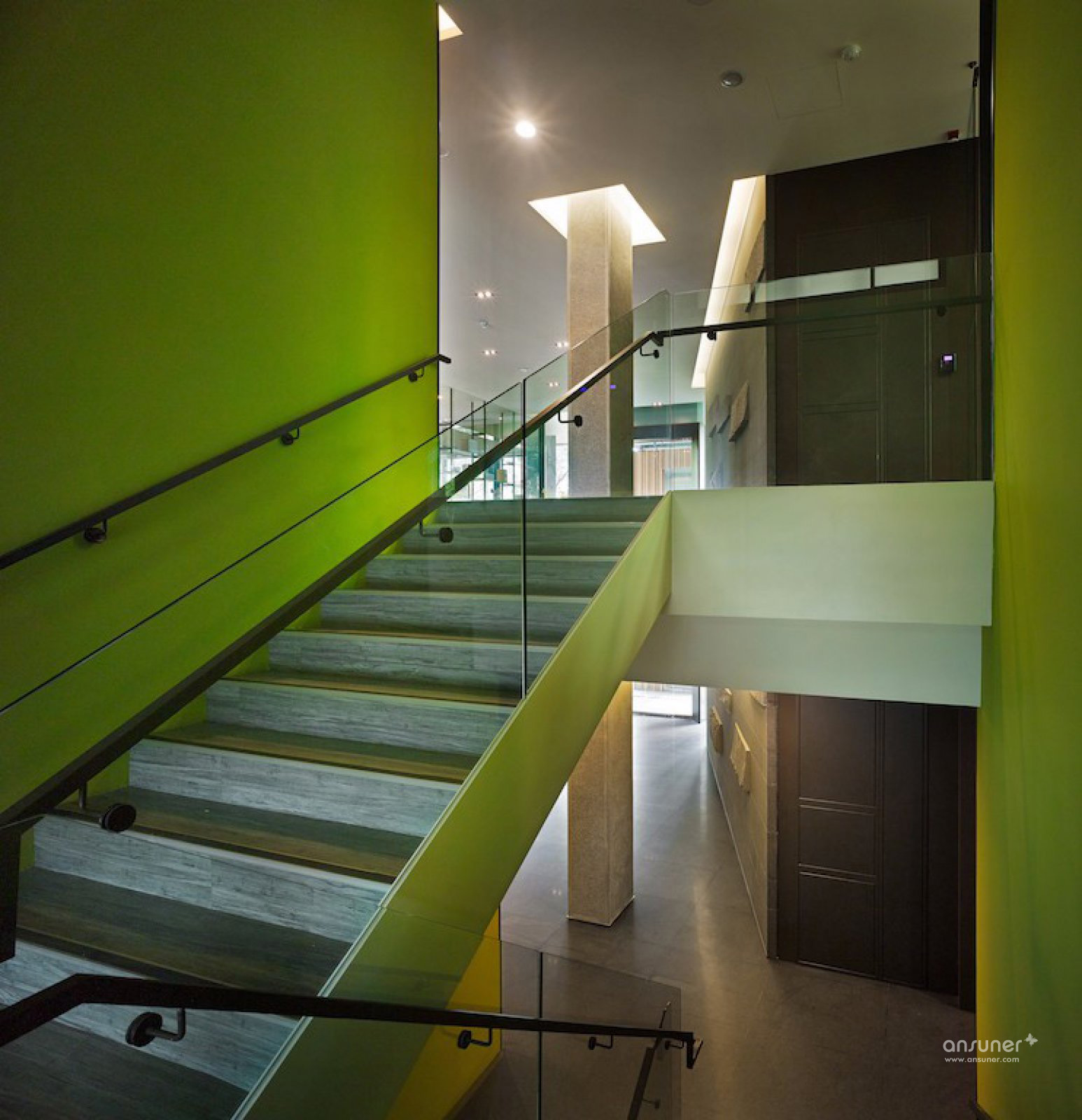 拾级而上,厚实的石块墙体同样以15度的斜轴贯穿二、三楼。短轴长轴的概念重现;短轴串起前后的透明电梯及楼梯,是各楼层的动线枢纽;长轴左侧的大会议室与沿着长轴排开的工作空间,紧密而不冲突。